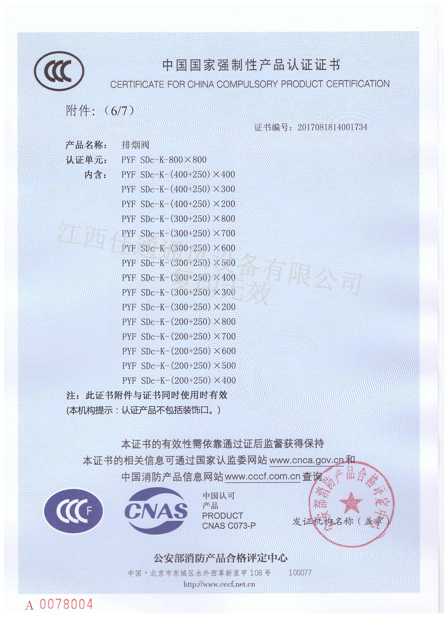 消防3C认证证书排烟阀800×800(分型6)