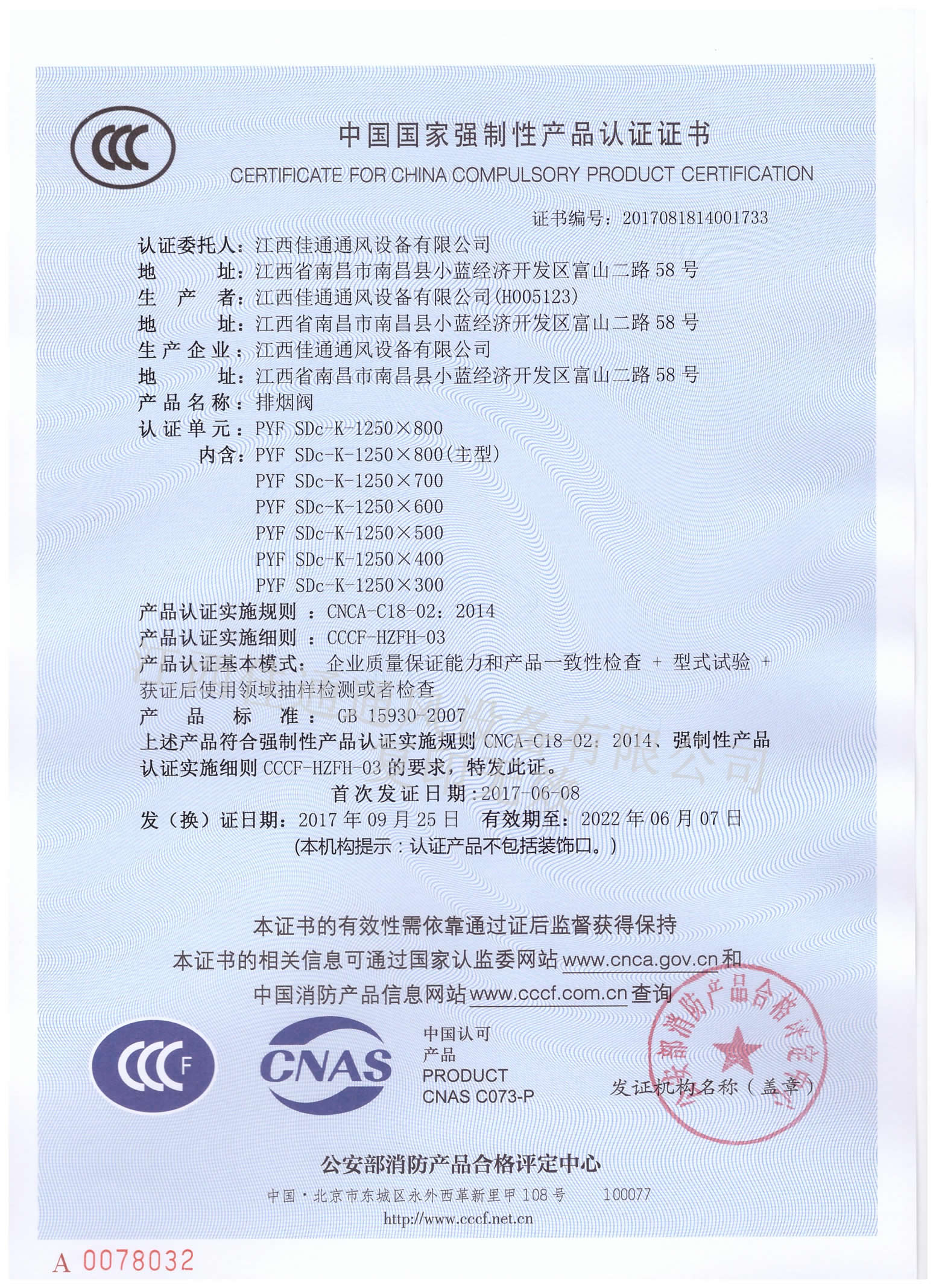 消防3C认证证书排烟阀1250×800