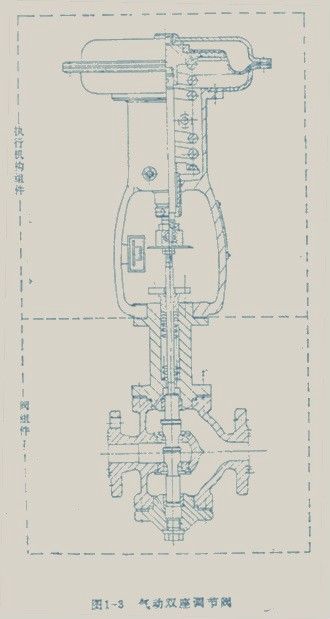 调节阀一般由执行机构和阀组件两个部分组成。在有些场合可带有阀门定位器、手轮机构等附件。调节阀中最典型的产品——气动双座调节阀的结构如图1-3所示。