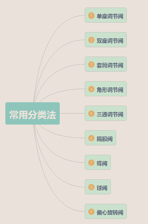 这种分类方法既按原理、作用又按结构划分,是目前国内、国际最常用的分类方法。一般分为九个大类,前6种为直行程,后3种为角行程。