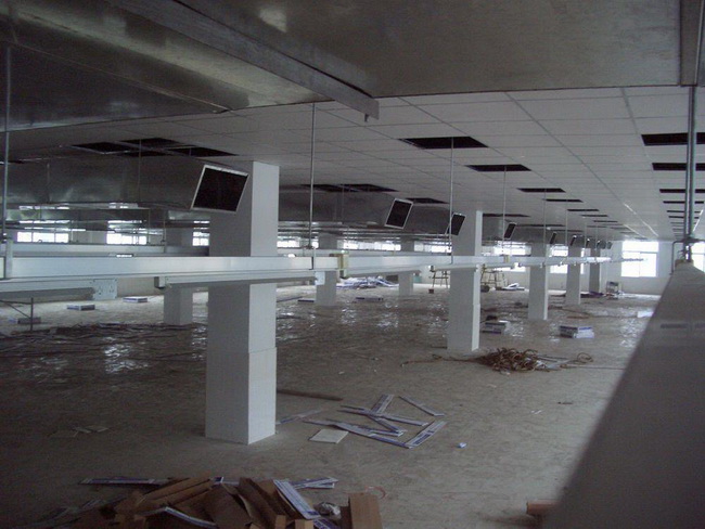 (5)挡烟垂壁。挡烟垂壁是用于分隔防烟分区的装置或设施,可分为固定式或活动式。固定式挡烟垂壁可采用隔墙、楼板下不小于500mm的梁或吊顶下凸出不小于500mm的不燃烧体;活动式挡烟垂壁本体采用不燃烧体制作,平时隐藏于吊顶内或卷缩在装置内,当其所在部位温度升高,或消防控制中心发出火警信号或直接接收烟感信号后,置于吊顶上方的挡烟垂壁迅速垂落至设定高度,限制烟气流动以形成“储烟仓”,便于排烟系统将高温烟气迅速排出室外。
