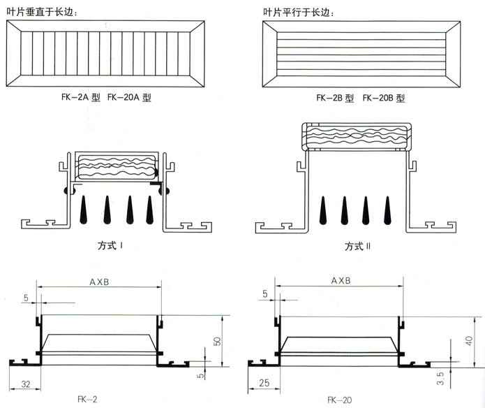 通常安装于管道或侧墙上作侧送风口.双层百叶风口有两层可调节角度的活动叶片,短叶片用于调节送风气流的扩散角,也可用于改变气流的方向;而调节长叶片可以使送风气流贴附顶棚或下倾一定的角度(当送暖风时).双层百叶风口的外层叶片或单层百叶风口的叶片可以平行于长边,也可以平行于短边,可以根据客户的要求来选择.